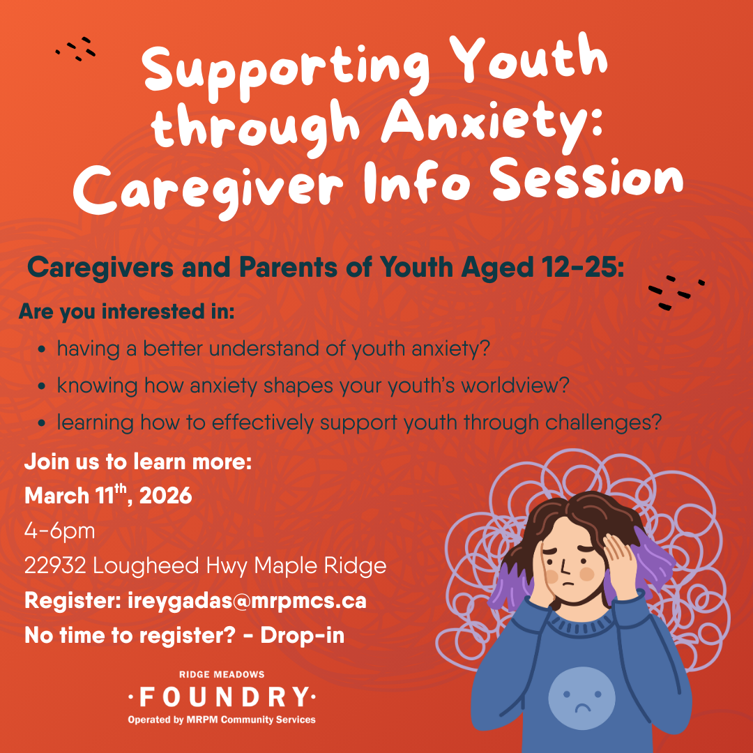 March 11 @ 4:00 pm – 6:00 pm Supporting Youth Through Anxiety: Caregiver Info Session (Foundry) Foundry Ridge Meadows 22932 Lougheed Hwy. #2, Maple Ridge, British Columbia, Canada Free