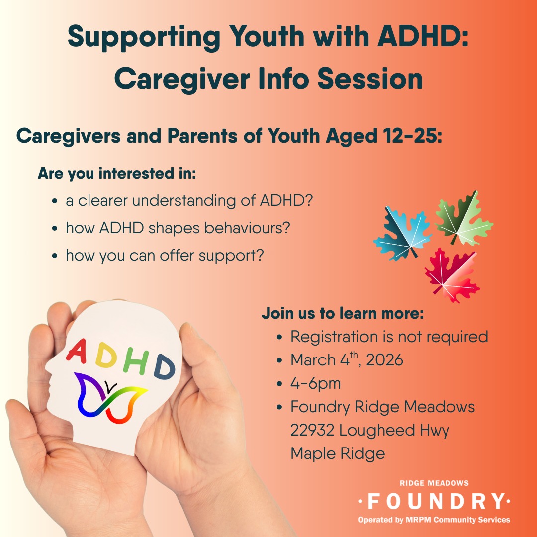 March 4 @ 4:00 pm – 6:00 pm Supporting Youth with ADHD – Caregiver Info Session (Foundry) Foundry Ridge Meadows 22932 Lougheed Hwy. #2, Maple Ridge, British Columbia, Canada Free