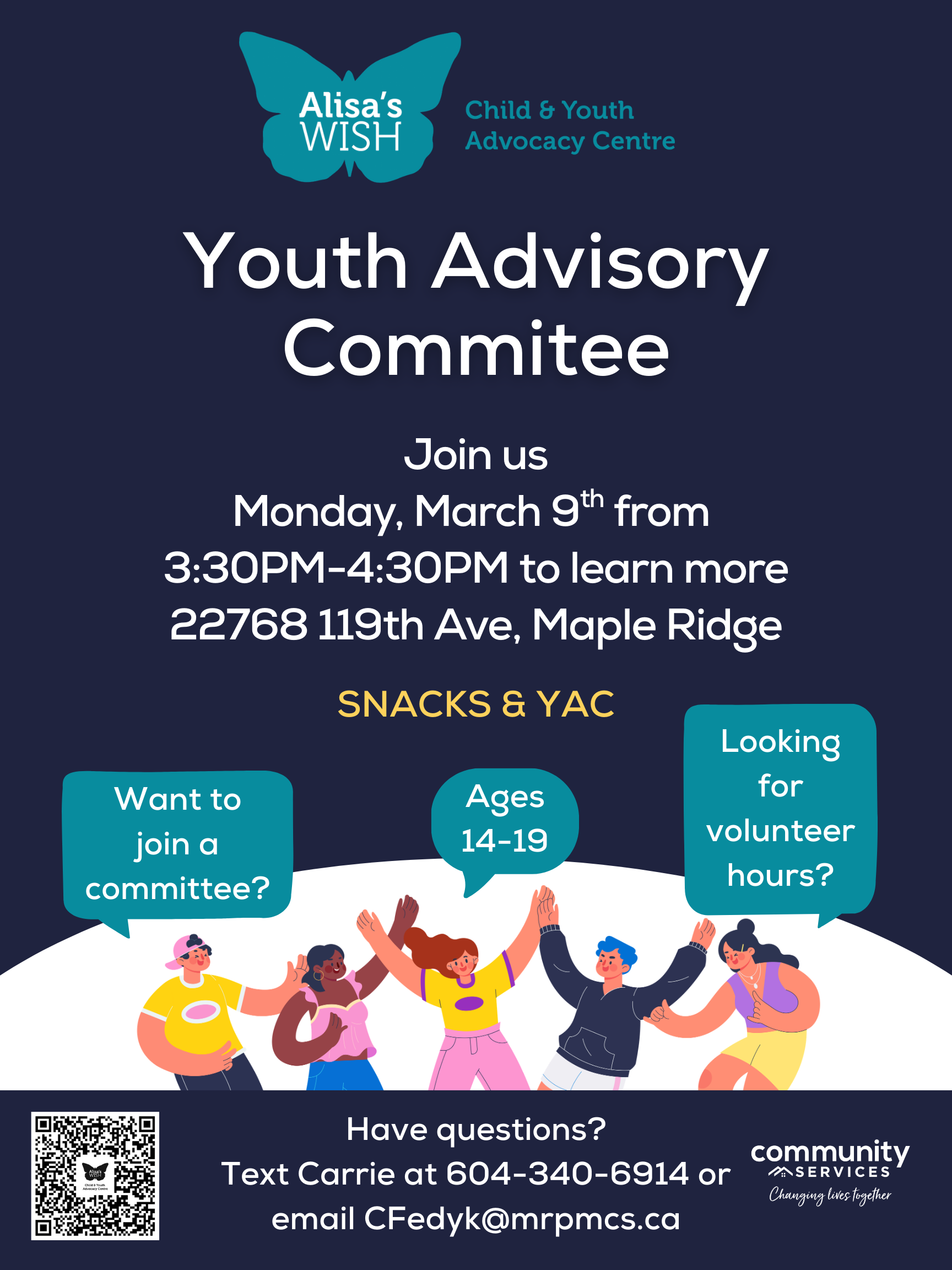 March 9 @ 3:30 pm – 4:30 pm Alisa’s Wish Youth Advisory Commitee (YAC) – Open Session Maple Ridge/Pitt Meadows Community Services 22768 119th Ave, Maple Ridge, British Columbia, Canada Free