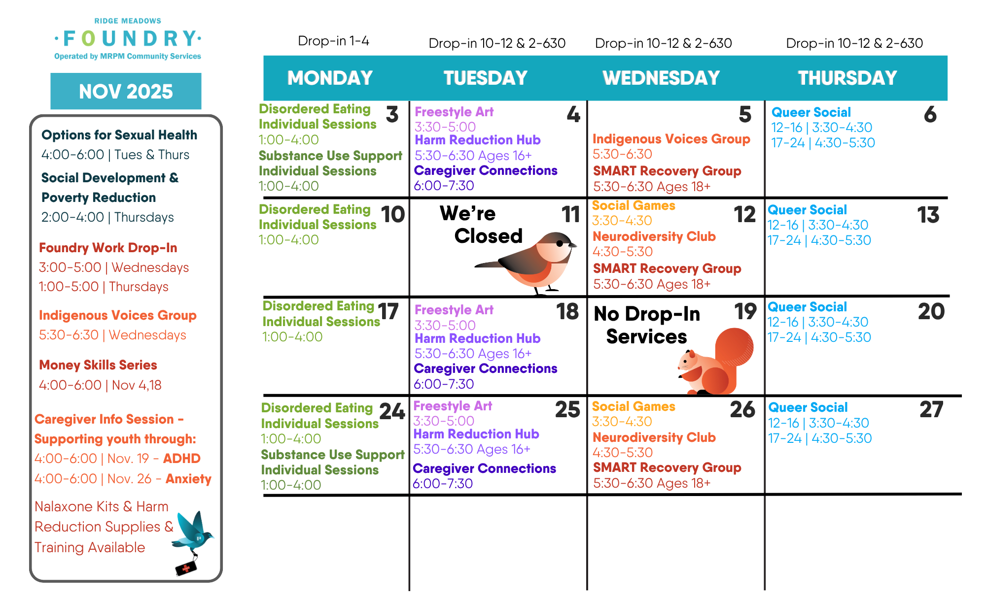 - Supplies: Foundry Ridge Meadows works hard to decrease barriers that may be impacting youth, be it food security, personal hygiene , or harm reduction.